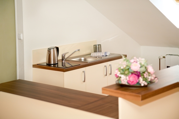 Kuchyně jsou zařízeny základním nádobím, mikrovlnou troubou, elektrickou troubou, varnou deskou, myčkou na nádobí, rychlovarnou konvicí. Vstup do každého apartmánu je přes terasu, každý apartmán má terasu vlastní samozřejmě vybavenou pohodlným nábytkem. Vybavení apartmánů je moderní, ve skandinávském stylu a budete se zde cítit velmi příjemně. Dbali jsme na to, abyste se u nás skvěle vyspali a apartmány jsme vybavili kvalitními matracemi. I přistýlky mají plnohodnotné matrace a rozměr rozložené přistýlky je 180 x 200 cm.