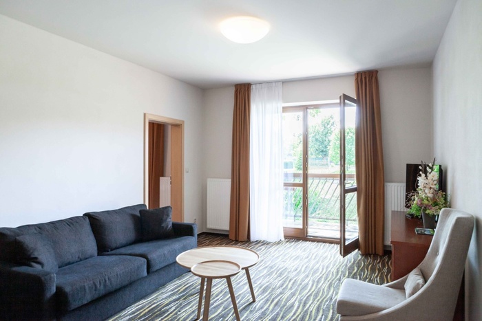 Příjemné čtyřhvězdičkové apartmá je zařízené v moderním stylu a osloví páry i rodiny s dětmi. Kromě ložnice má také vlastní kuchyňku, koupelnu s vanou a oddělenou toaletou. Příjemné posezení si můžete užít hned na dvou balkonech s výhledem do zahrady a na rybníček.