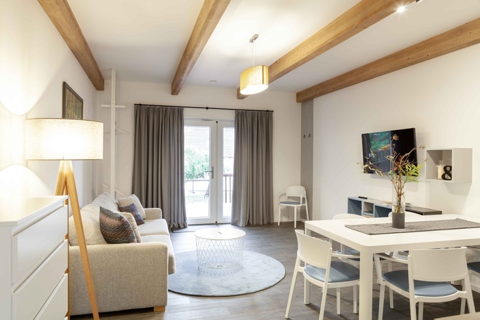 Kuchyně jsou zařízeny základním nádobím, mikrovlnou troubou, elektrickou troubou, varnou deskou, myčkou na nádobí, rychlovarnou konvicí. Vstup do každého apartmánu je přes terasu, každý apartmán má vlastní terasu samozřejmě vybavenou pohodlným nábytkem. Vybavení apartmánů je moderní, ve skandinávském stylu a budete se zde cítit velmi příjemně. Dbali jsme na to, abyste se u nás skvěle vyspali a apartmány jsme vybavili kvalitními matracemi. I přistýlky mají plnohodnotné matrace a rozměr rozložené přistýlky je 180 x 200 cm..